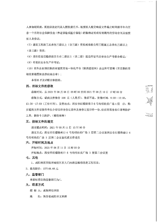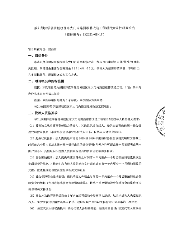 咸阳师范学院渭城校区东大门内路面维修改造工程项目竞争性磋商公告