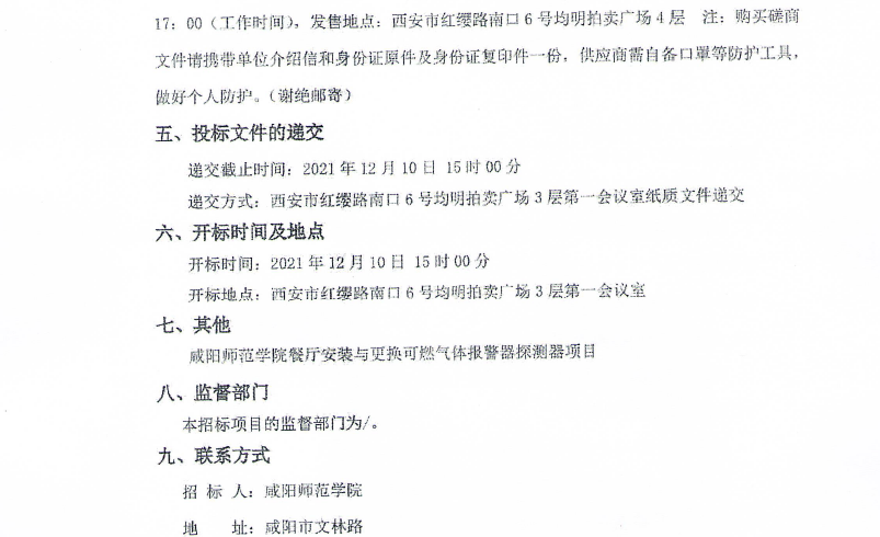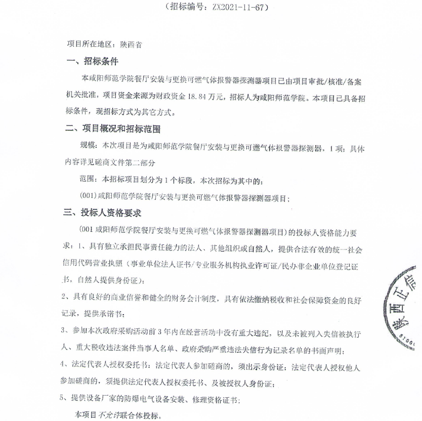咸阳师范学院餐厅安装与更换可燃气体报警器探测器项目竞争性磋商公告