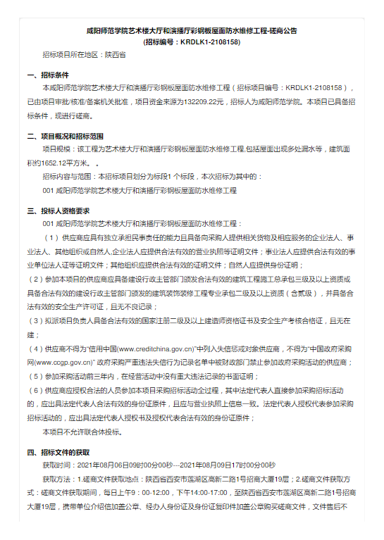 咸阳师范学院艺术楼大厅和演播厅彩钢板屋面防水维修工程项目磋商公告