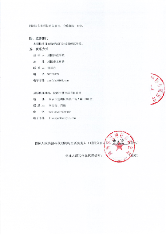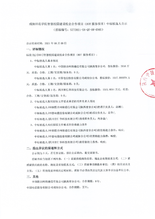 咸阳师范学院智慧校园建设校企合作项目(BOT服务项目)中标候选人公示