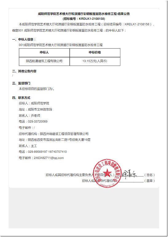 咸阳师范学院艺术楼大厅和演播厅彩钢板屋面防水维修工程-结果公告