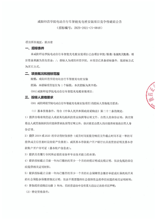 咸阳师范学院电动自行车智能充电桩安装项目竞争性磋商公告