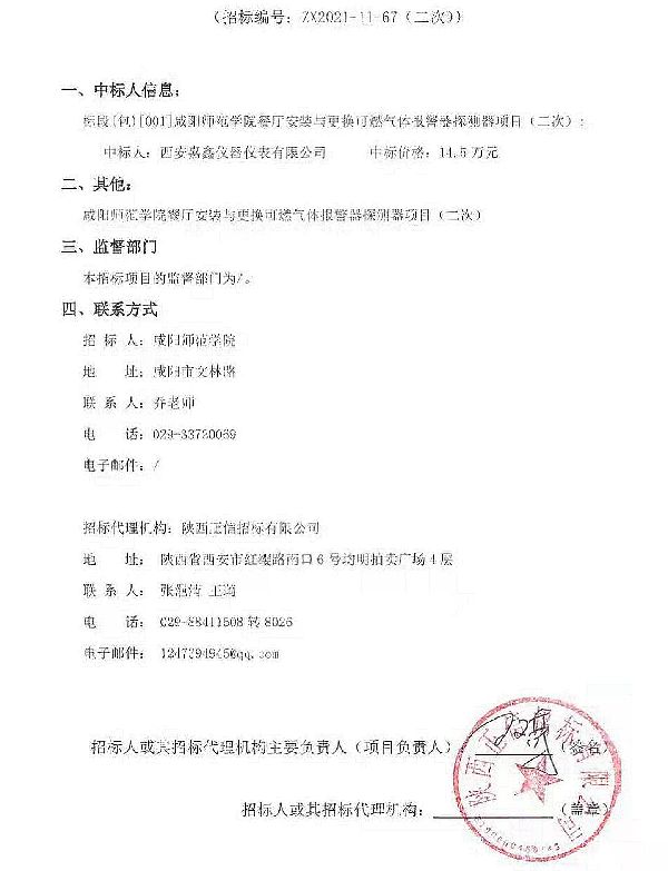 咸阳师范学院餐厅安装与更换可燃气体报警器探测器项目(二次)的采购结果公告