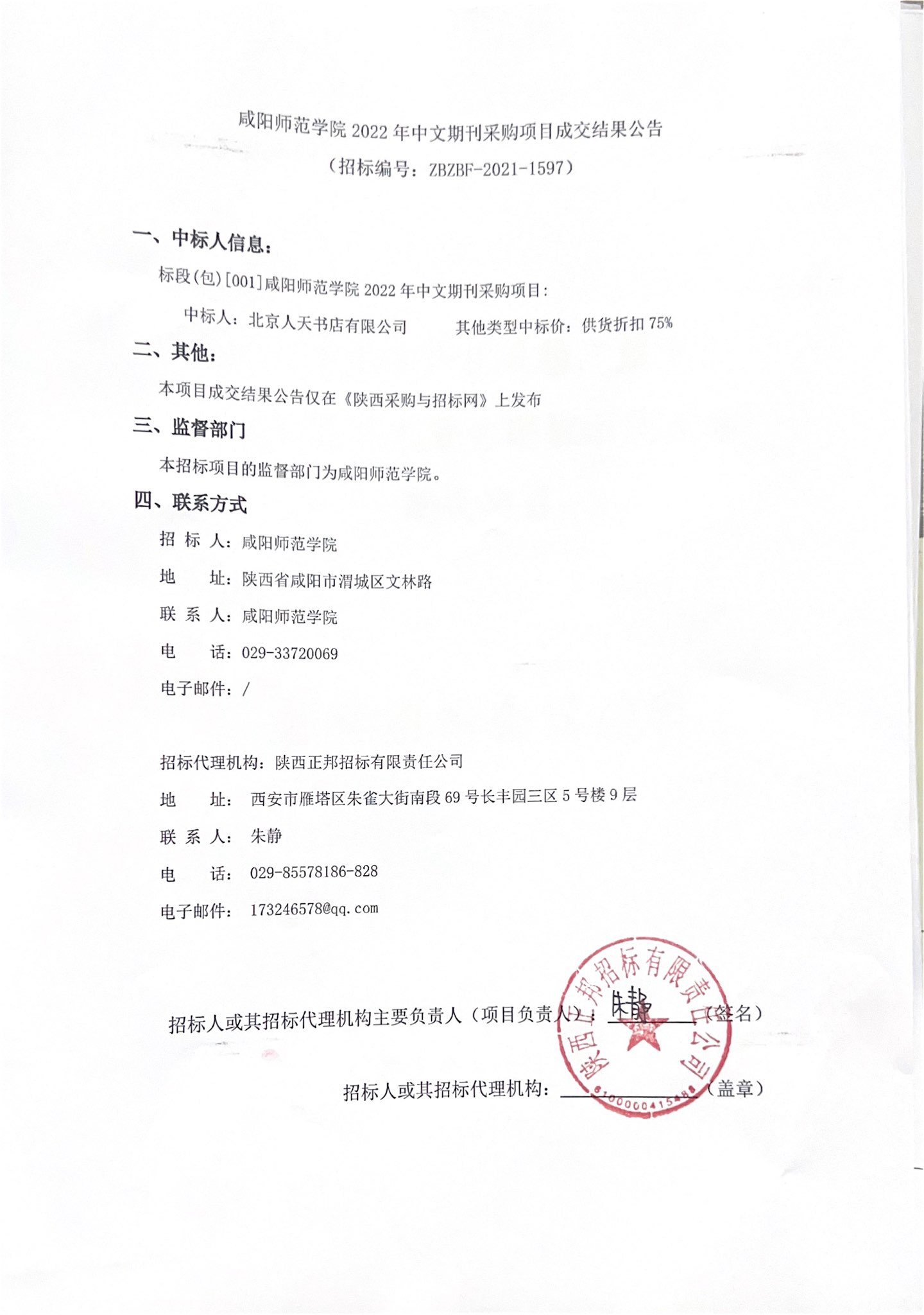 咸阳师范学院 2022 年中文期刊采购项目成交结果公告